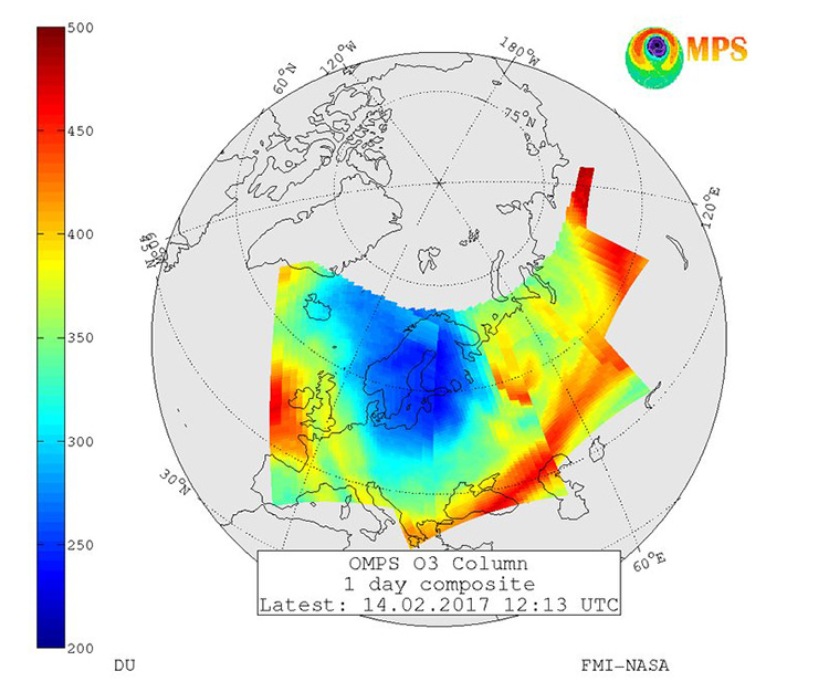 Viime viikolla, 14.2.2017, OMPS-instrumentin mittauksista prosessoitiin kuva Ilmatieteen laitoksella Sodankylässä. Siinä Suomen yllä on havaittavissa selkeä otsonipitoisuuden pienentyminen. Sen vaikutuksesta UV-säteilyyn ei tarvitse olla huolissaan, sillä helmikuussa UV-säteilyn määrä Suomessa on varsin vähäinen.