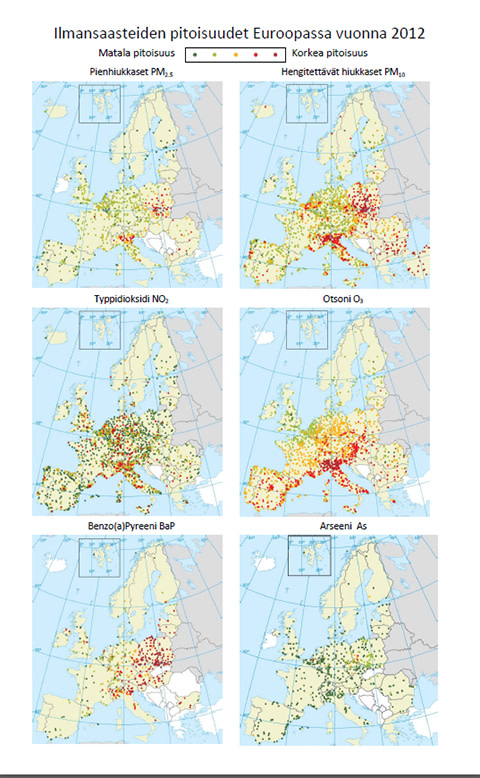 EEA:n arvion mukaan suurimman riskin eurooppalaisille aiheuttavat edelleen hiukkaset (PM2.5 ja PM10) ja otsoni (O3). "Näiden rinnalle on nyt nostettu myös karsinogeeninen benzo(a)pyreeni (BaP), jota pääsee kaupunki-ilmaan muun muassa puun pienpoltossa, liikenteen pakokaasuissa sekä teräksentuotannossa. BaP on hengitysilmassa kiinnittyneenä pienhiukkasiin (PM2.5) ja voi näin kulkeutua syvälle ihmisen elimistöön", kertoo Ilmatieteen laitoksen tutkija Pia Anttila. Nykyään jopa neljännes Euroopan Unionin kqupunkiväestöstä altistuu hengitysilman kautta tavoitearvon ylittäville BaP-pitoisuuksille. Pahimmat alueet sijaitsevat Keski- ja Itä-Euroopassa. Toisin kuin useimpien muiden ilmansaasteiden pitoisuudet, BaP–pitoisuudet eivät ole laskusuunnassa johtuen hiilen ja biomassan pienpolton lisääntymisestä Euroopassa. Ilmatieteen laitoksen mukaan Suomessakin tiiviisti rakennetuilla pientaloalueilla erityisesti talvikautena ajoittain esiintyy korkeita BaP-pitoisuuksia, mutta vuositasolla pitoisuudet eivät yleensä ylitä EU:n ilmanlaatunormeja. Vuonna 2013 benzo(a)pyreenin tavoitearvo ei ylittynyt yhdelläkään ilmanlaadun mittausasemalla Suomessa.