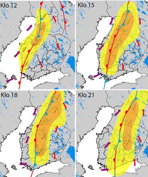 Kuva: Ennuste aaltoilevan rintamavyöhykkeen liikkeestä ja vaarallisimpien ukkosten esiintymisalueesta. Keltaisella värillä ukkospuuskat yli 15 m/s, oranssilla yli 25 m/s.