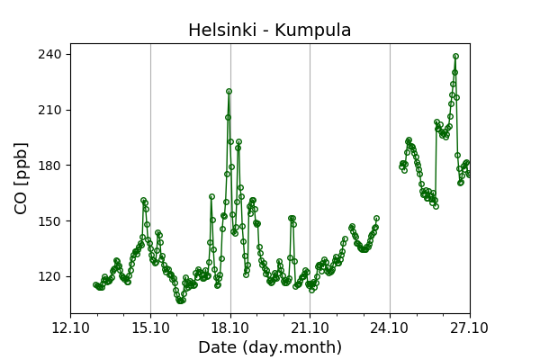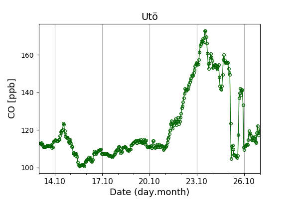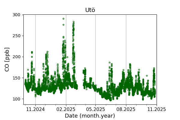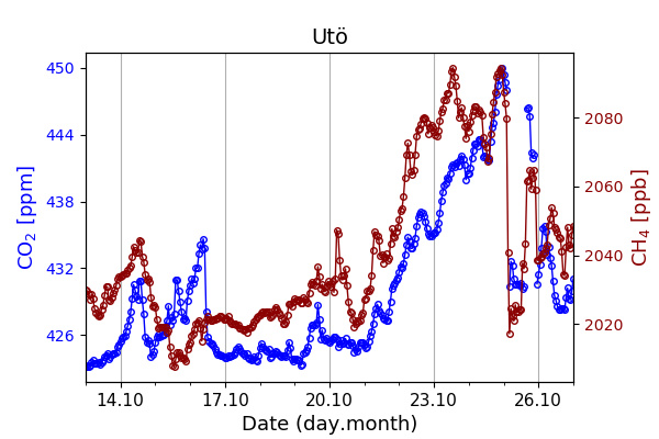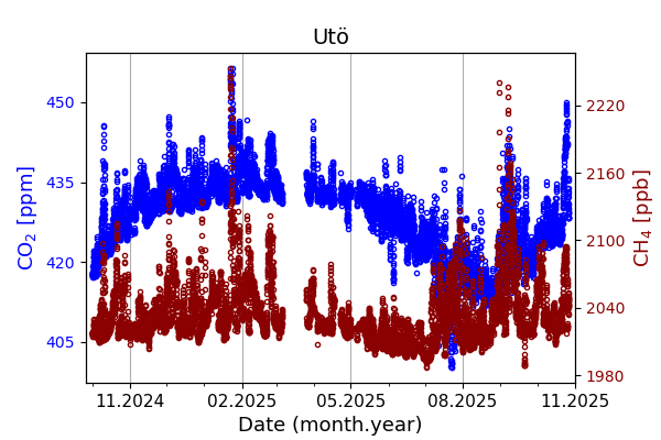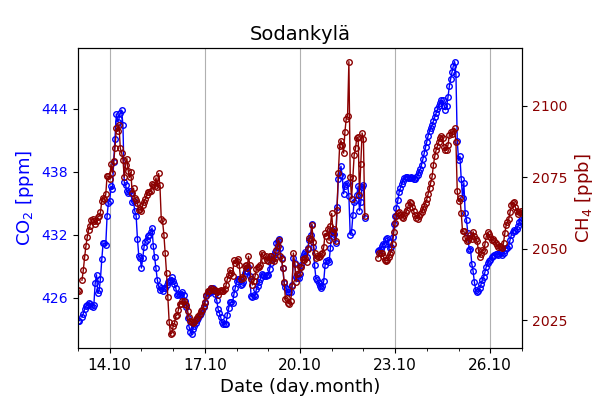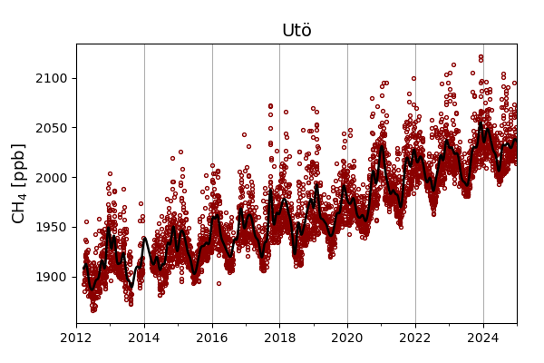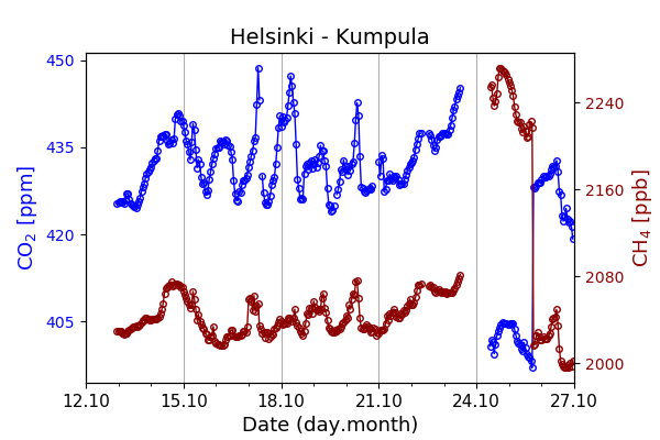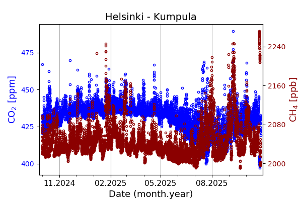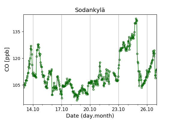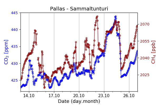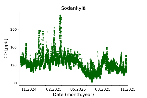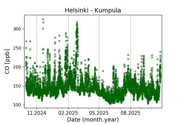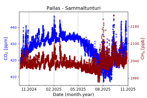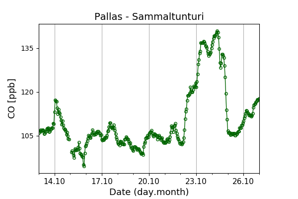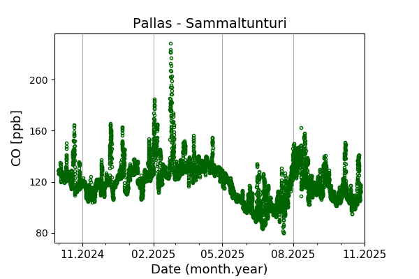Hiilidioksidin, metaanin ja hiilimonoksidin pitoisuudet Pallas-Sammaltunturin, Sodankylän, Helsinki-Kumpulan ja Utön asemilla esitetään pitkäaikaisena usean vuoden aikasarjana (päiväkeskiarvot), sekä viimeisimmät havainnot vuoden ja kahden viikon jaksoilta (tuntikeskiarvot).