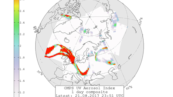 Ilmatieteen laitoksen satelliittihavaintojen pohjata tekemistä aerosolikartoista näkyy, kuinka Kanadan metsäpaloista peräisin olevat savut saapuvat Euroopan ylle. Oheinen kartta näyttää tilanteen maanantaina 21. elokuuta. Nämä metsäpalojen savut kulkeutuvat yläilmakehässä, eivätkä ole havaittavissa maanpinnalla. Savuilla ei ole vaikutusta myöskään hengitysilmaan.