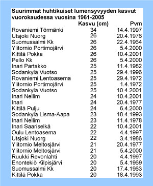 Huhtikuiset pyryt ovat Lapissa vielä sangen tavanomaisia, lähes joka toinen vuosi esiintyy huhtikuussa 10 - 15 cm pyryjä. Taulukossa ovat suurimmat huhtikuun pyryjen lumensyvyyden kasvut yhdessä vuorokaudessa Pohjois-Suomessa.