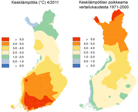 Huhtikuu alku 2010 oli koko maassa tavanomaista lämpimämpänä. Itä-Suomessa sekä Pohjois-Suomen itäosissa kuukauden alkupuolisko oli laajalti poikkeuksellisen lämmin.