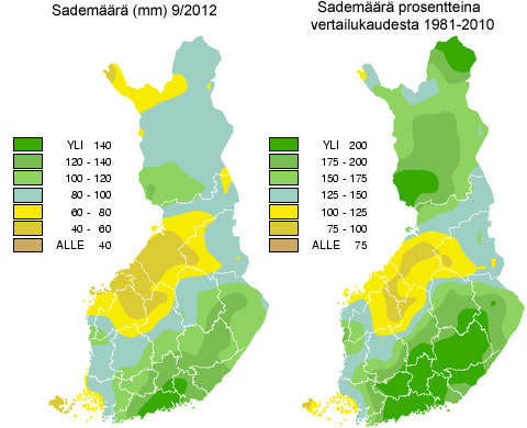 Syyskuu 2012 oli suurimmassa osassa maata tavanomaista sateisempi. Pitkäaikaiseen keskiarvoon verrattuna runsassateisimmilla alueilla päästiin yli kaksinkertaisiin sademääriin, kun taas vähäsateisimmilla alueilla jäätiin alle tavanomaisten arvojen. Yksittäisistä havaintoasemista eniten satoi Helsingin Kumpulassa, jossa sadetta kertyi 177 mm. Helsingin Kaisaniemessä sademäärä kohosi 160 millimetriin, mikä on aseman runsaan 150 vuoden mittaushistorian suurin syyskuun sademäärä. Edellinen ennätys 159 mm on peräisin vuodelta 1918. Myös muun muassa Helsinki-Vantaalla ja Utsjoen Kevolla mitattiin aseman mittaushistorian suurin syyskuun sademäärä.