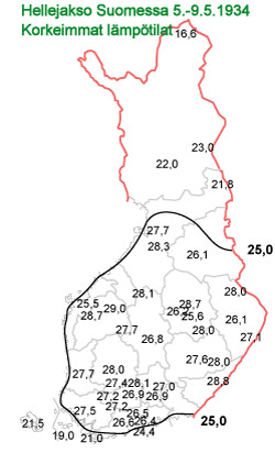Karttaan on merkitty kunkin havaintopaikan korkein mitattu lämpötila välillä 5.-9.5.1934. Kaikkein korkein lämpötila, 29,0 astetta mitattiin Kauhavalla 6.5.1934. Sitäpä ei saavutettu vuonna 2004!