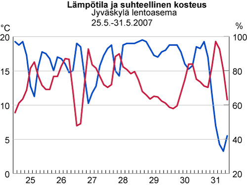 Kuvassa punainen käyrä esittää lämpötilan kolmen tunnin välein ja sen asteikko on vasemmalla. Sininen esittää vastaavasti ilman suhteellisen kosteuden arvon ja sen asteikko on oikealla. Päivämääräluku on keskipäivän kohdalla. Kuvasta nähdään, että Jyväskylässä suhteellinen kosteus pysyi myös hyvin suurena iltapäivästä 28.5. lähtien aina 31.5 aamuyöhön asti. Sään seljettyä 31. 5. niin lämpötila kuin kosteus palasivat ajankohdan tyypillisiin lukemiin, lämpötila iltapäivällä vajaaseen 20 asteeseen ja suhteellinen kosteus alle 50 %:n.