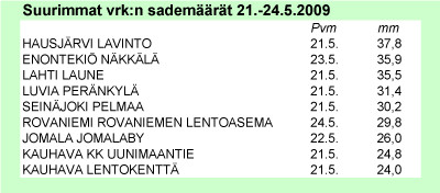 Toukokuun loppupuolella on saatu runsaita sateita eri puolilla Suomea. Helatorstaina 21.5.2009 sade- ja ukkoskuuroja liikkui iltapäivällä maamme yli itään sateen ollessa maan etelä- ja länsiosassa paikoin rankkaa. Toukokuun paikkakuntakohtaisia vuorokausisade-ennätyksiä puolestaan rikottiin lauantaina 23.5. Enontekiöllä ja sunnuntaina 24.5. Rovaniemellä. Koko Suomen toukokuun vuorokausisade-ennätys, 88 millimetriä, mitattiin Kuusankoskella 31.5.1988. Lisätietoa rankkasateista verkkosivuillamme: Rankkasadetilastot