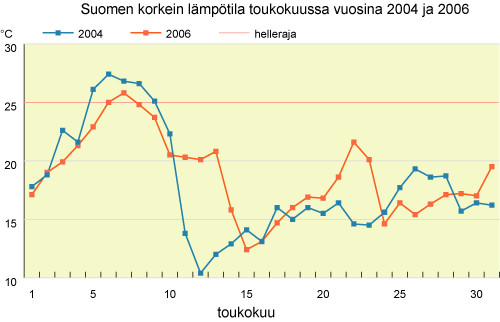 Vuonna 2004 saavutettiin hellelukemia useana päivänä maan eteläosassa. Kuvassa vertailuna koko maan ylimmät lämpötilat 2004 ja 2006.