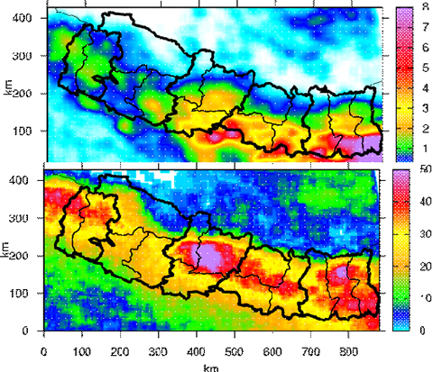 Ylempi kuva: Salamaniskutiheys neliökilometriä kohden Nepalissa 1.4.-30.6.2012.Alempi kuva: Ukkospäivien lukumäärä Nepalissa 1.4.-30.6.2012.