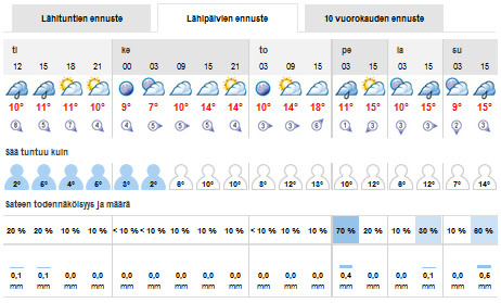 Lähituntien ja lähipäivien ennusteissa mukana tuntuu kuin -lämpötila sekä sateen todennäköisyys ja määrä. Tuntuu kuin -hahmo on oranssi kun sää tuntuu vähintään 2 astetta lämpimämmältä kuin ennustettu lämpötila.