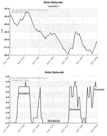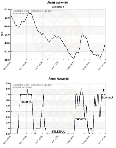 Yllä nähdään kaksi kuvaajaa, ylempi on lämpötila ja alempi on pilvisyys (asteikolla 0..9, 0=selkeää, 8=pilvistä, 9=pilvisyyttä ei voida määrittää). Havainnot ovat Ähtäri Myllymäen havaintoasemalta 4. tammikuuta 2011. Kuvista nähdään selvästi, kuinka pilvisyyden runsastuessa lämpötila lähtee selvään nousuun ja vastaavasti pilvisyyden vähetessä lämpötila putoaa nopeasti. Esimerkiksi noin 05 UTC (klo 8 Suomen aikaa) lämpötila oli noin -22,5 astetta ja pilvisyys oli runsasta. Tämän jälkeen pilvipeite nopeasti väheni ja sää oli pitkälti selkeää 16 UTC (klo 18 Suomen aikaa) saakka. Tuolloin lämpötila oli tippunut lähelle -28 astetta. Eli pitkälti pilvipeitteen repeämisen takia lämpötila laski 11 tunnissa noin 5,5 astetta. Tämä on melko tyypillinen esimerkki pilvisyyden vaikutuksesta. Suurempiakin eroja voi esiintyä.