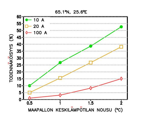 Todella tukalia helleaaltoja esiintyi 1900-luvun lopun ilmastossa laskennallisesti vain kerran sadassa vuodessa. 2010-luvun ilmastossa näin kovien helteiden vuotuinen esiintymistodennäköisyys oli kohonnut lähes neljään prosenttiin (kuva 2). Puolentoista asteen lämpenemisen tasolla todennäköisyydeksi saatiin lähes 10 % ja kahden asteen tasolla jo noin 15 %. Nähdään siis, että jos ilmastonmuutosta jarrutetaan, tällaiset todella äärimmäiset helteet eivät yleisty yhtä nopeasti.