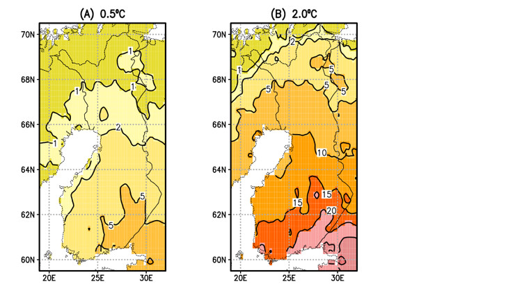 Jos maapallo lämpenisi teollistumista edeltävään aikaan verrattuna kahdella asteella, hellejaksoihin kuuluvien päivien lukumäärä olisi suuressa osassa Suomea tuolloin 4–5 kertaa niin suuri kuin 1900-luvun lopulla (kuva 1). Absoluuttinen muutos on suurin Etelä-Suomessa mutta suhteellinen muutos pohjoisessa. Hellejaksojen ankaruutta kuvaava kesän yhteenlaskettu hellelämpösumma suurentuisi vieläkin enemmän.