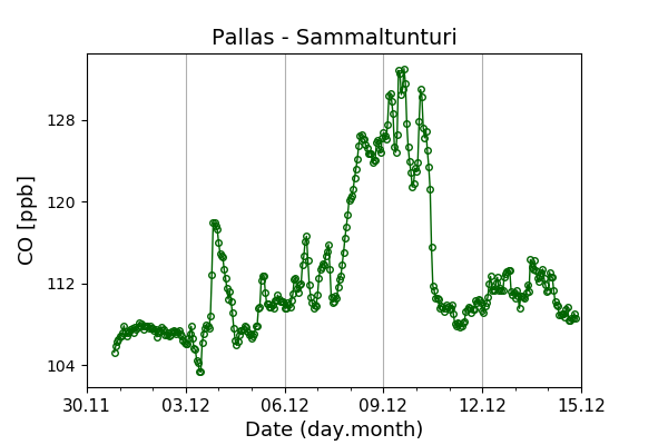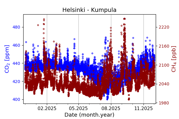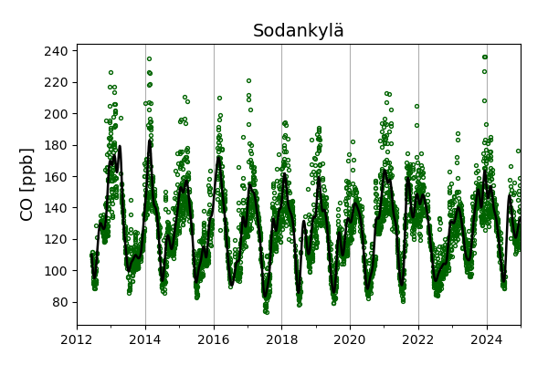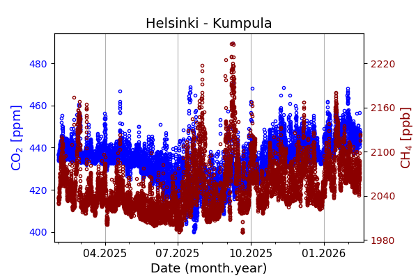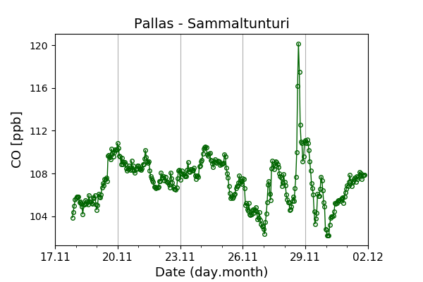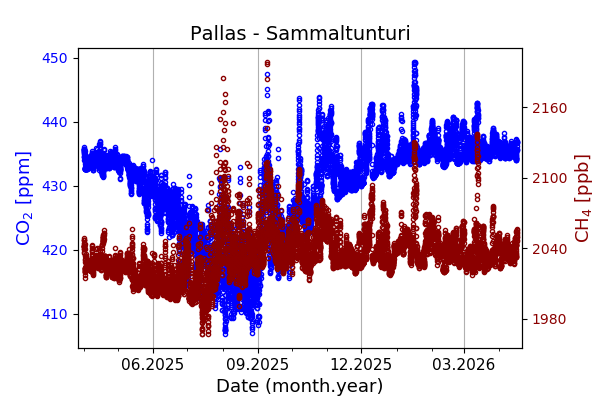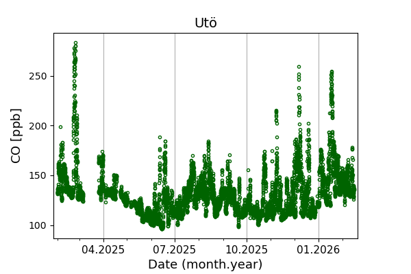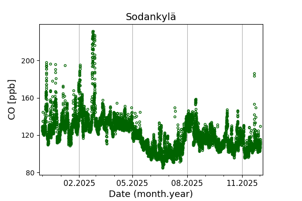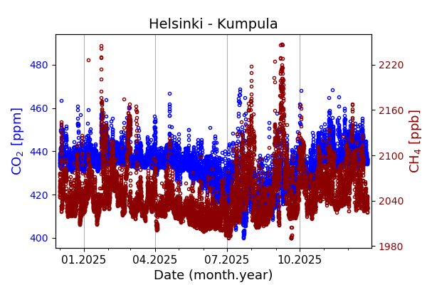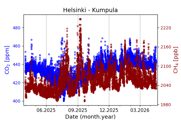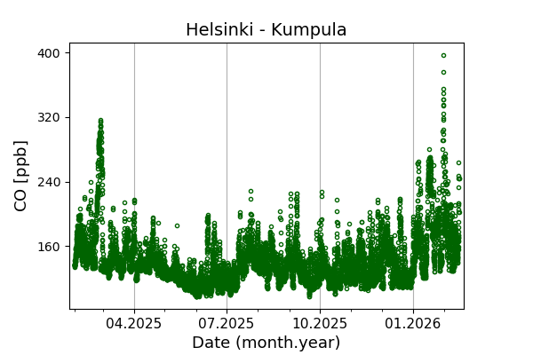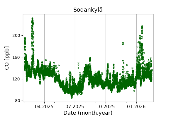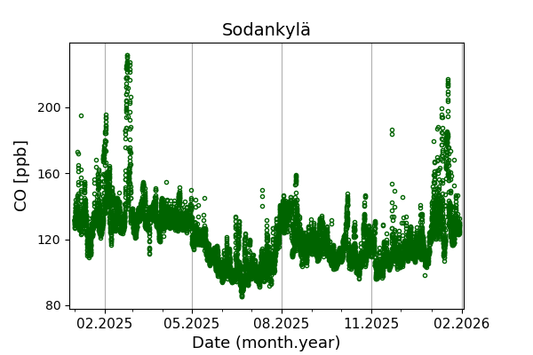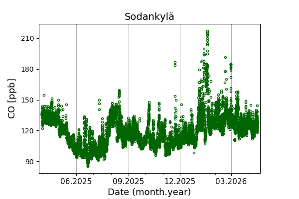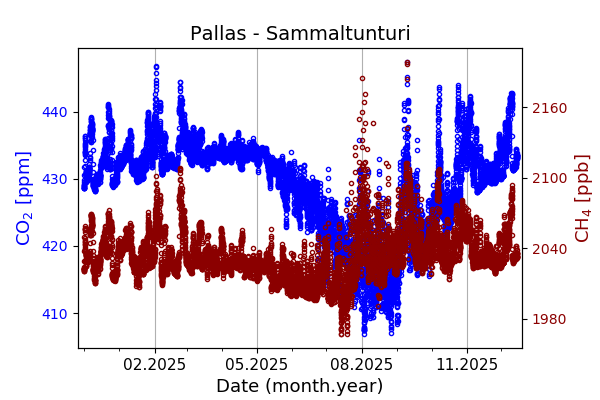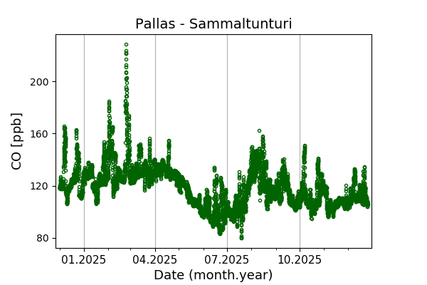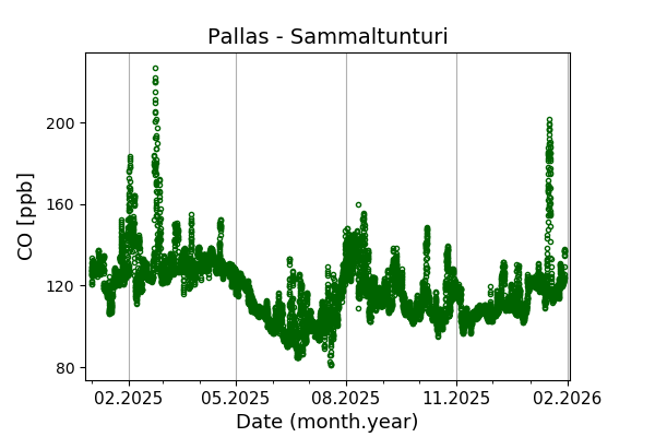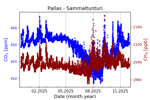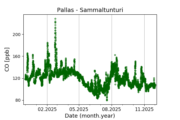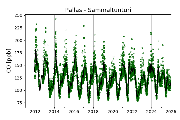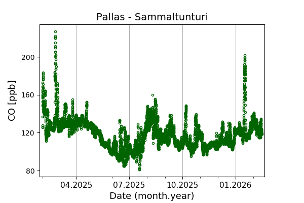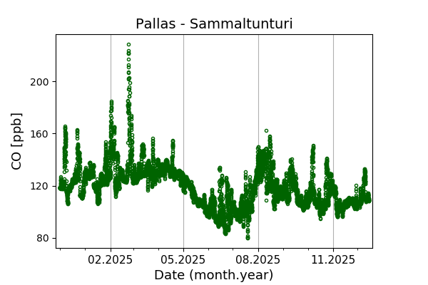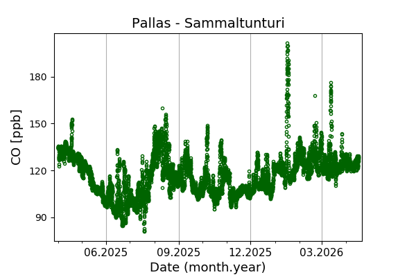Hiilidioksidin, metaanin ja hiilimonoksidin pitoisuudet Pallas-Sammaltunturin, Sodankylän, Helsinki-Kumpulan ja Utön asemilla esitetään pitkäaikaisena usean vuoden aikasarjana (päiväkeskiarvot), sekä viimeisimmät havainnot vuoden ja kahden viikon jaksoilta (tuntikeskiarvot).