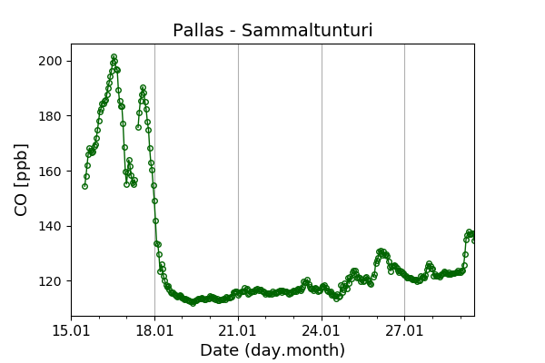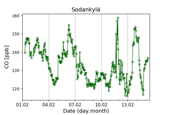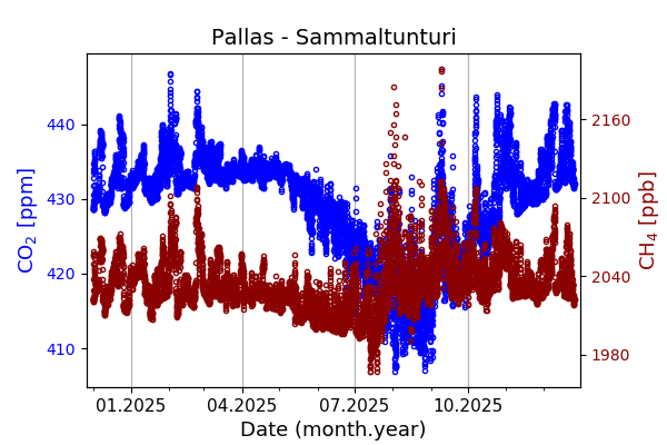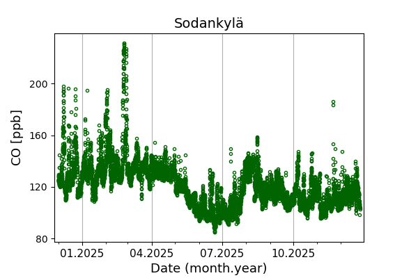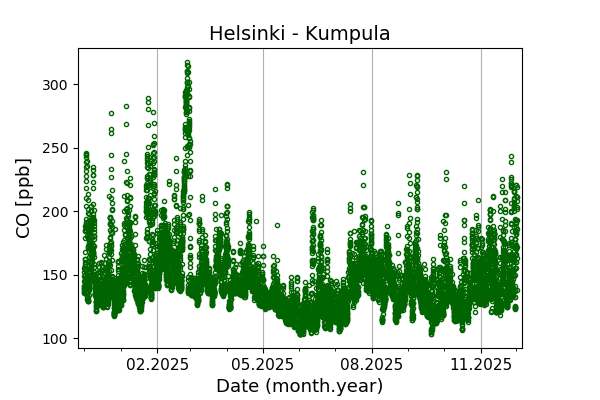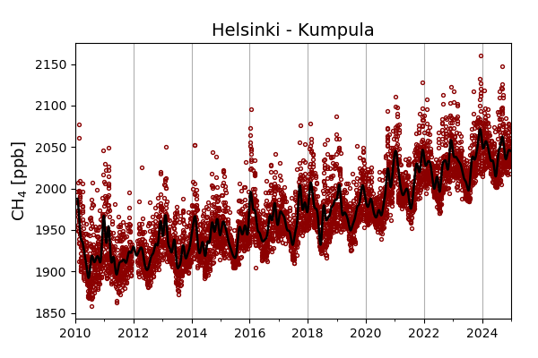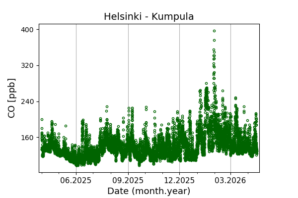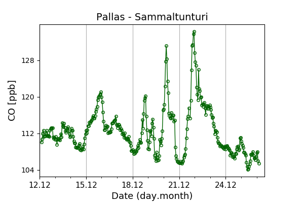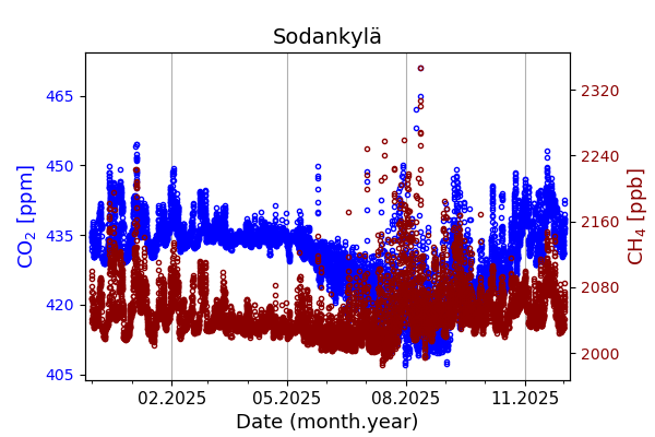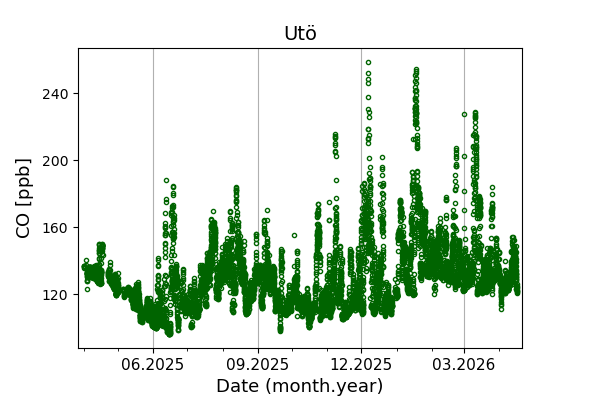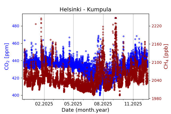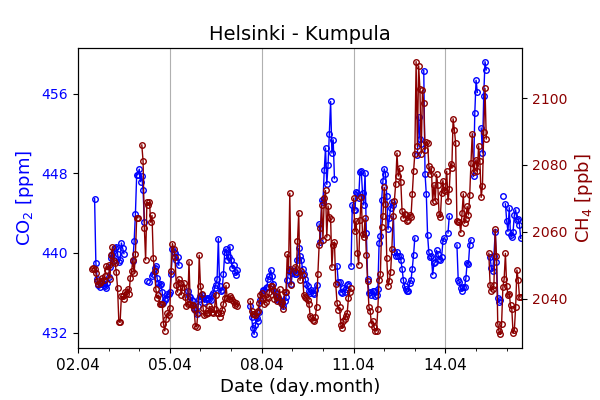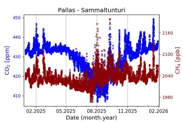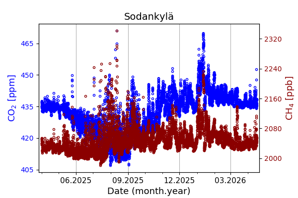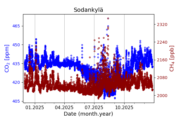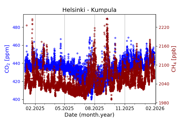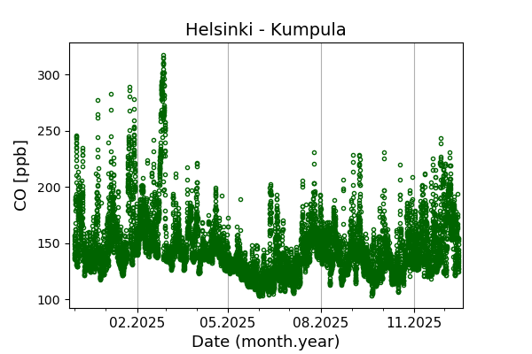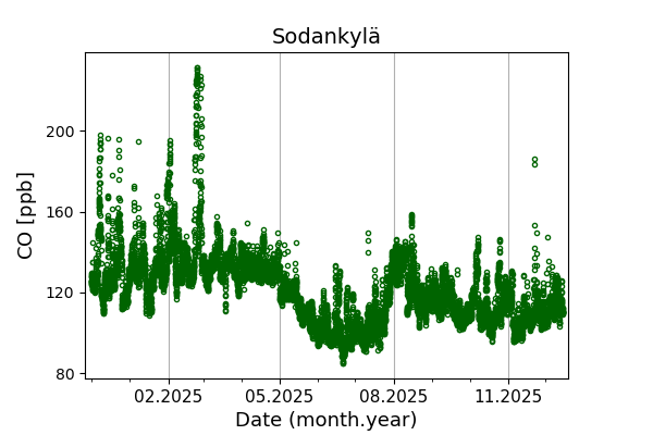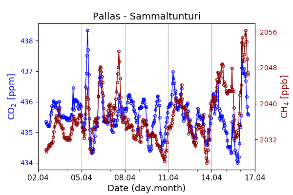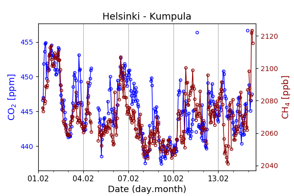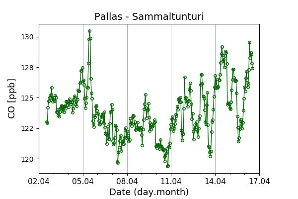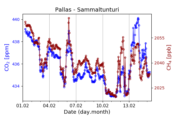 Hiilidioksidin, metaanin ja hiilimonoksidin pitoisuudet Pallas-Sammaltunturin, Sodankylän, Helsinki-Kumpulan ja Utön asemilla esitetään pitkäaikaisena usean vuoden aikasarjana (päiväkeskiarvot), sekä viimeisimmät havainnot vuoden ja kahden viikon jaksoilta (tuntikeskiarvot).