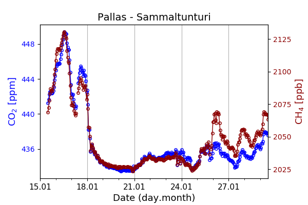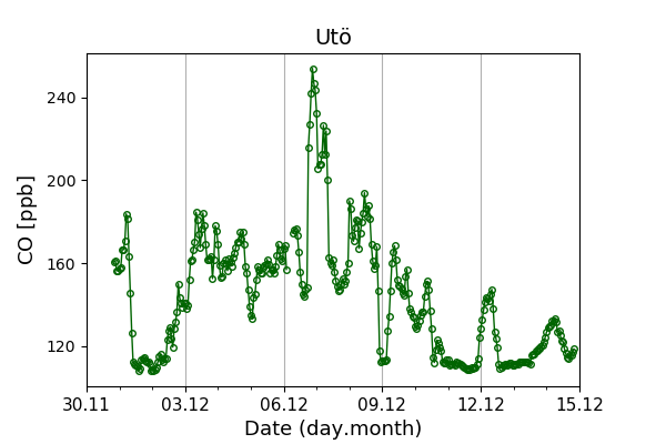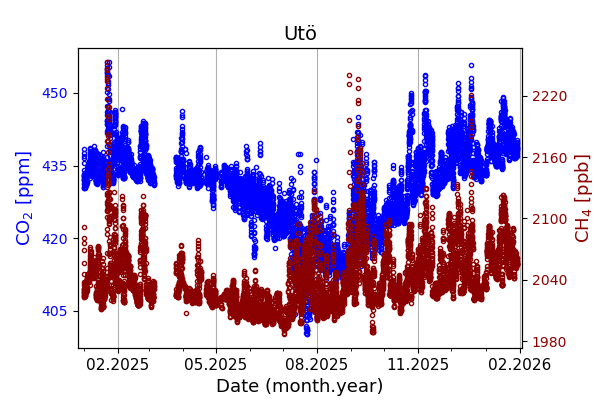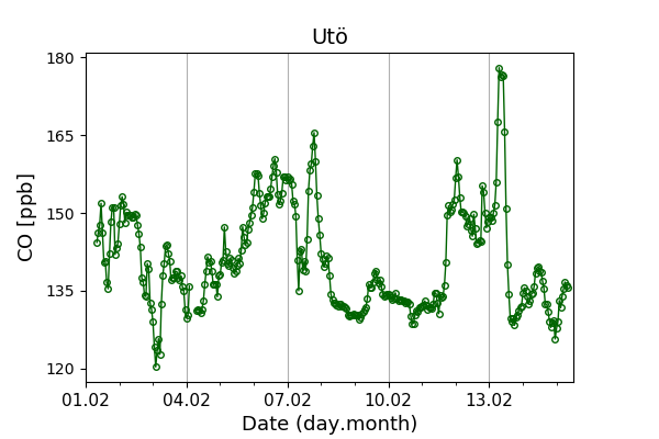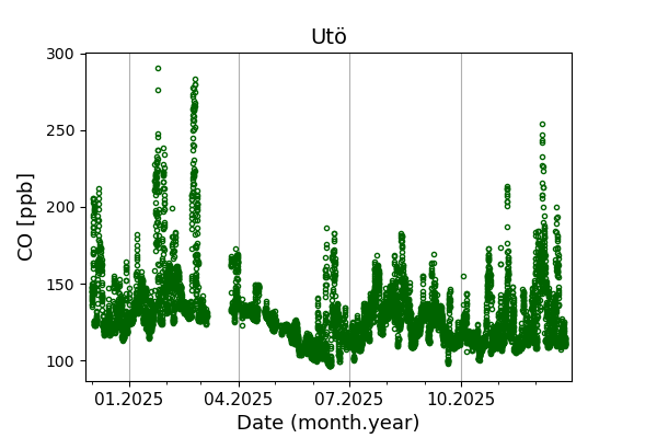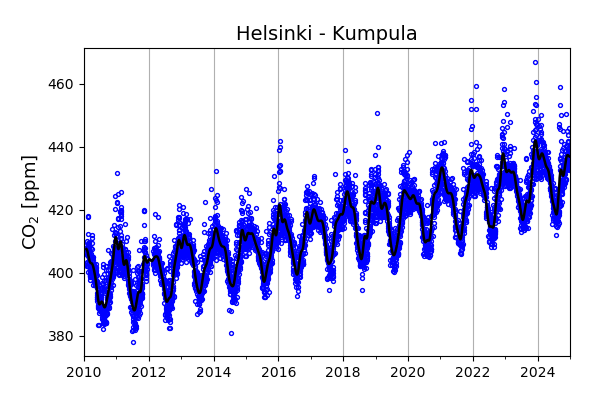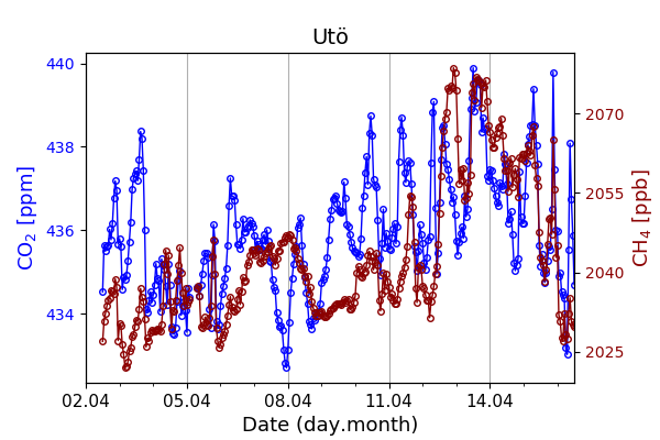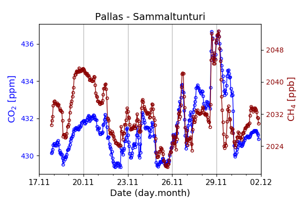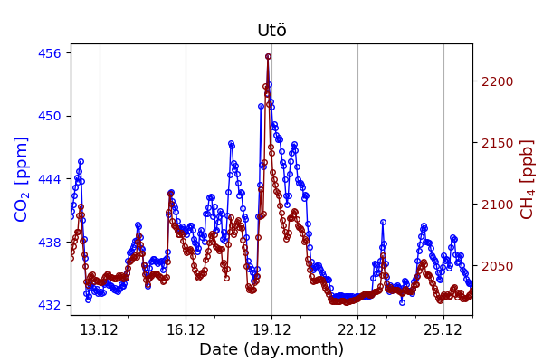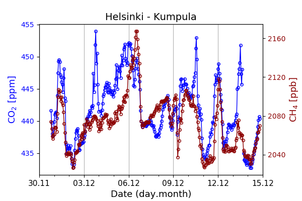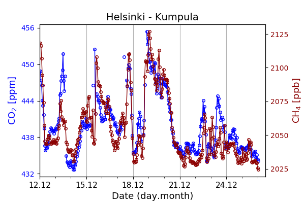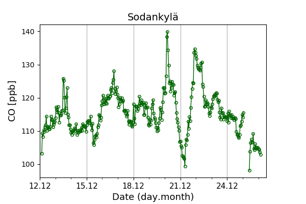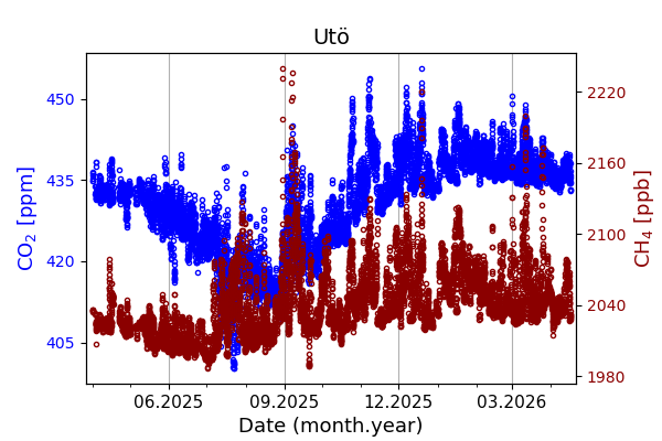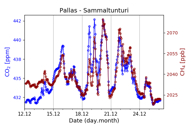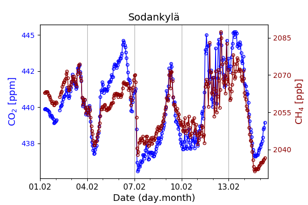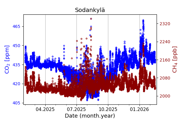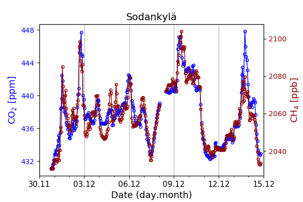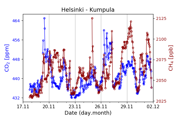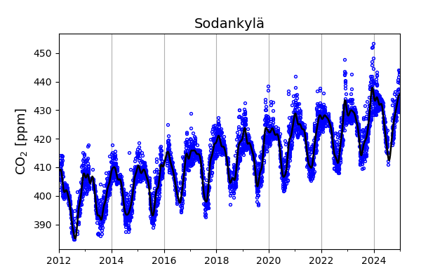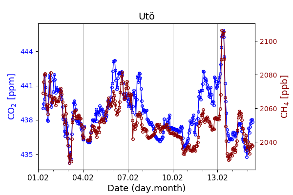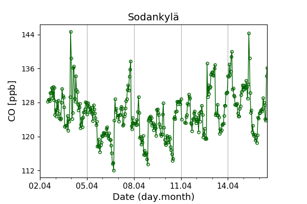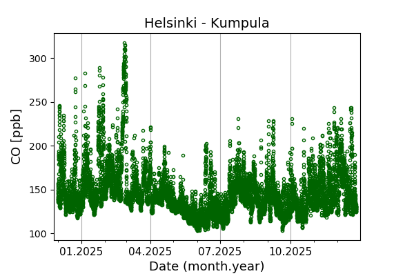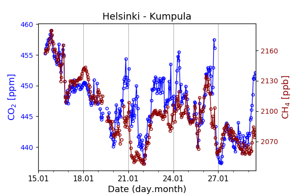 Hiilidioksidin, metaanin ja hiilimonoksidin pitoisuudet Pallas-Sammaltunturin, Sodankylän, Helsinki-Kumpulan ja Utön asemilla esitetään pitkäaikaisena usean vuoden aikasarjana (päiväkeskiarvot), sekä viimeisimmät havainnot vuoden ja kahden viikon jaksoilta (tuntikeskiarvot).