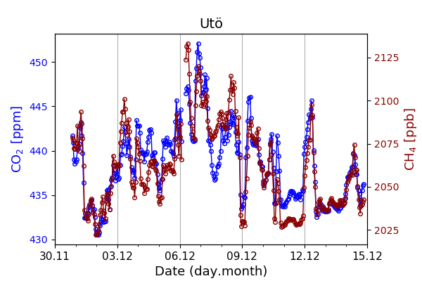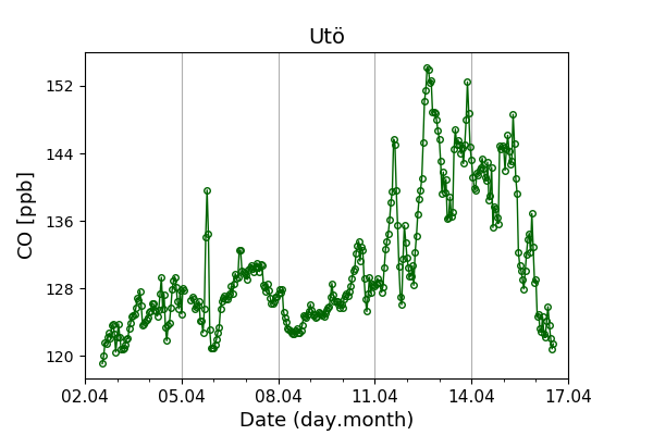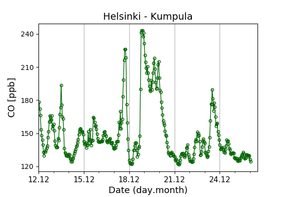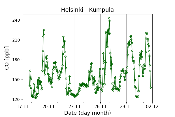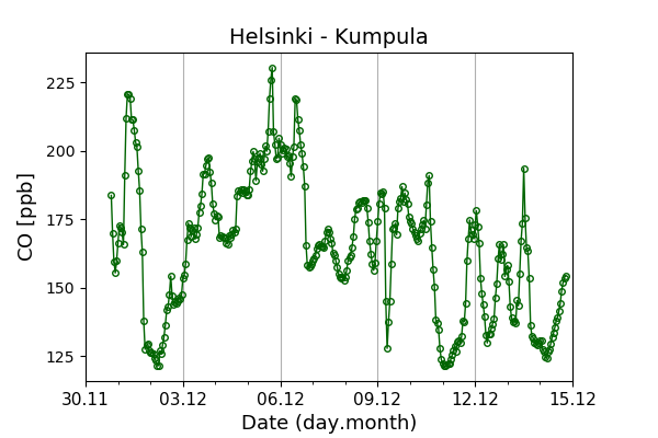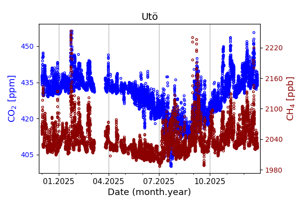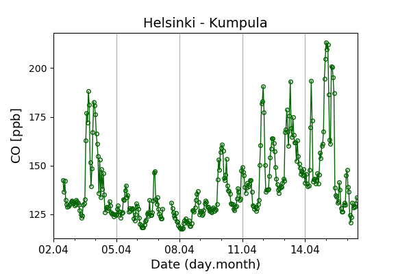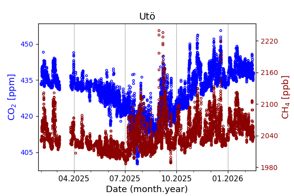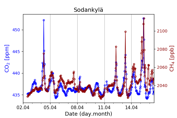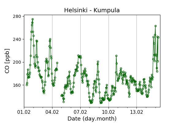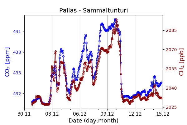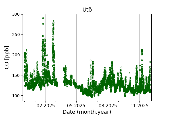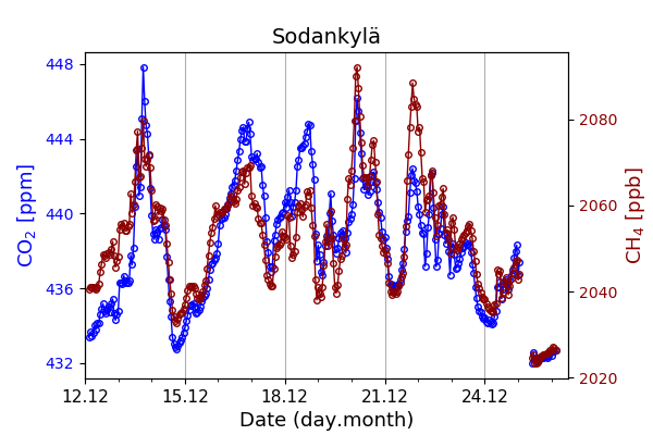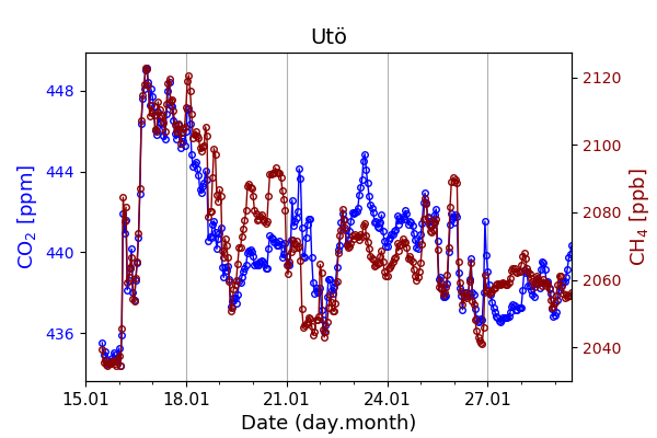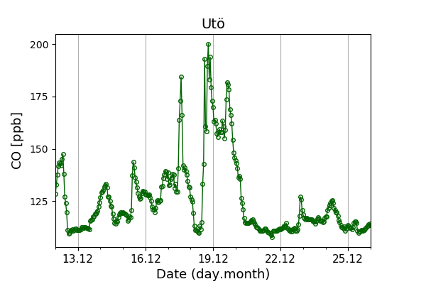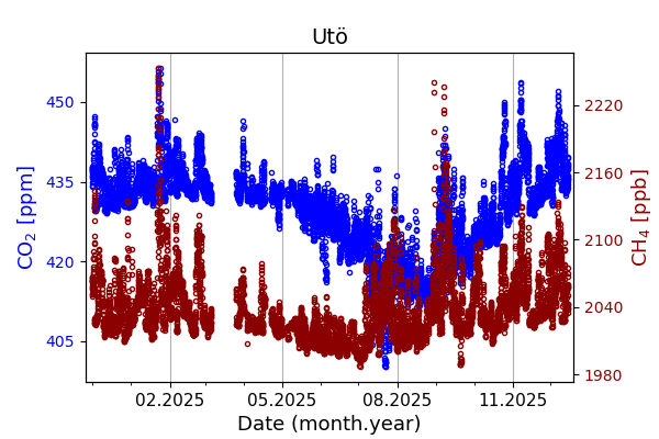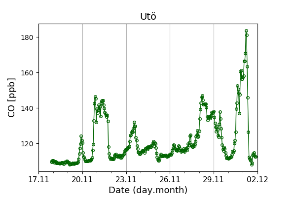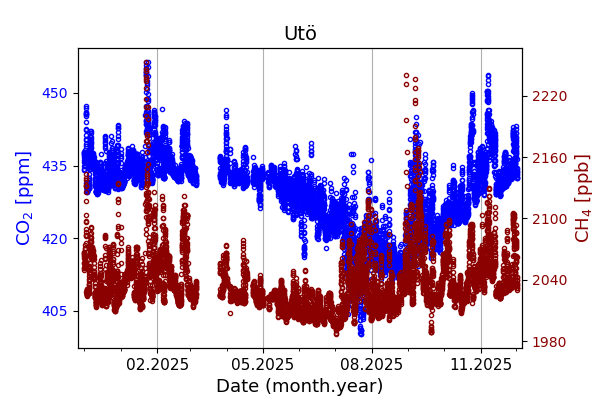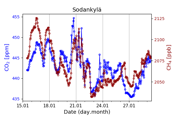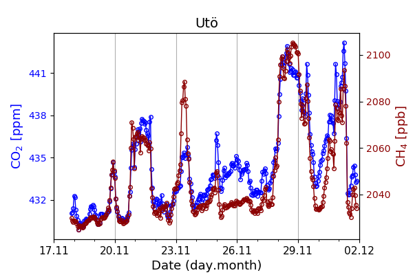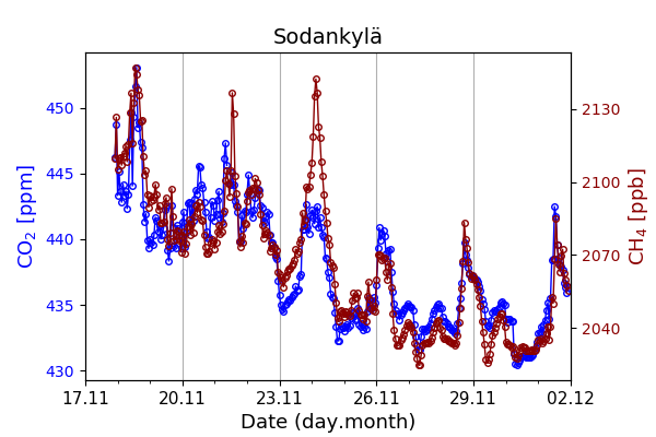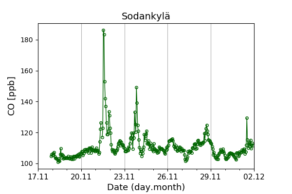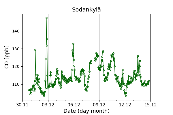 Hiilidioksidin, metaanin ja hiilimonoksidin pitoisuudet Pallas-Sammaltunturin, Sodankylän, Helsinki-Kumpulan ja Utön asemilla esitetään pitkäaikaisena usean vuoden aikasarjana (päiväkeskiarvot), sekä viimeisimmät havainnot vuoden ja kahden viikon jaksoilta (tuntikeskiarvot).