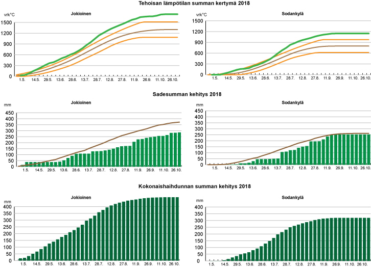 Kuvassa ruskealla viivalla on merkitty kauden 1981-2010 keskiarvo. Lämpösummakuvassa oranssit viivat kuvaavat 95 % ja 5 % rajoja. Yksi jakoväli x-akselilla on 5 vuorokautta.