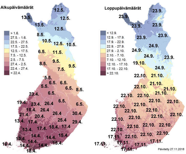Termisen kasvukauden alkamis- ja päättymispäivät 2018