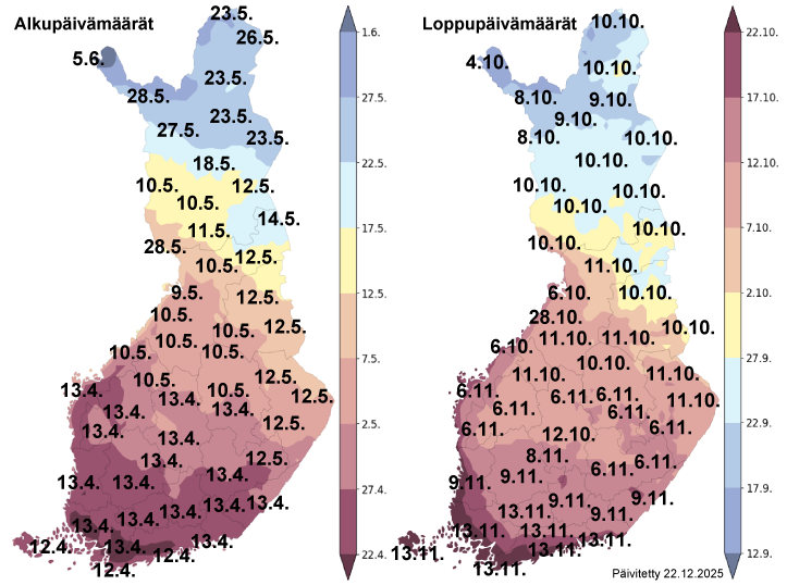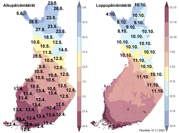 Termisen kasvukauden alkamis- ja päättymispäivät 2025