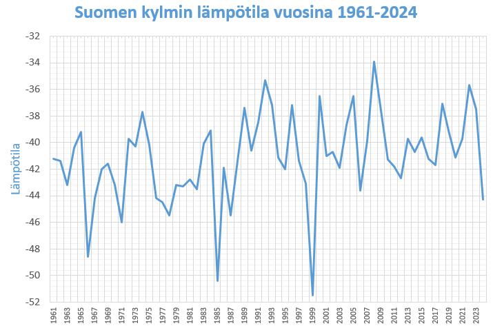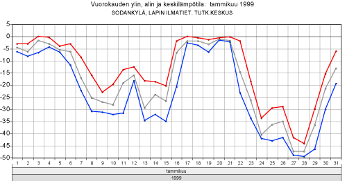 Tammikuun lopussa 1999 oli noin viikon ajan Pohjois- ja Keski-Lapissa 45 - 50 asteen pakkaset. Suomen kylmin mittaus, -51,5 astetta saavutettiin Kittilän Pokassa 28.1.1999.