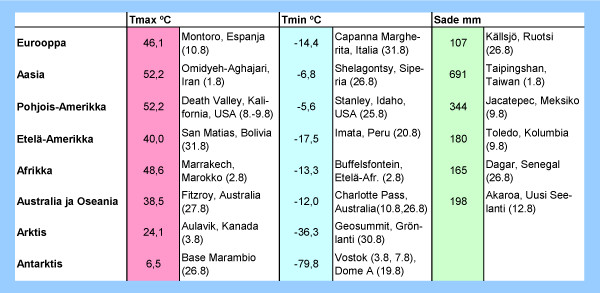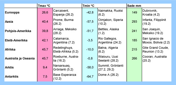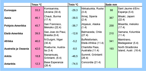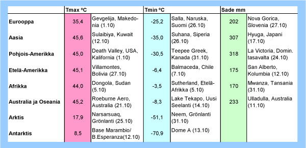 Taulukko: Syyskuun 2012 ylimmät ja alimmat lämpötilat sekä suurimmat vuorokautiset sademäärät eri puolilla maapalloa