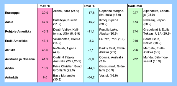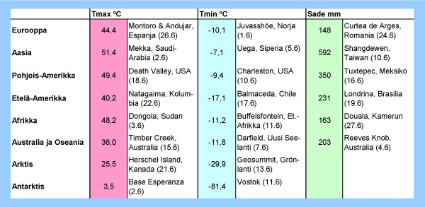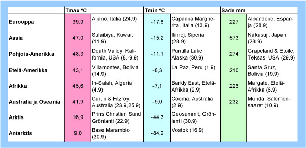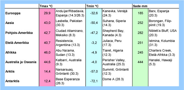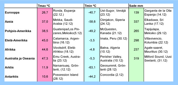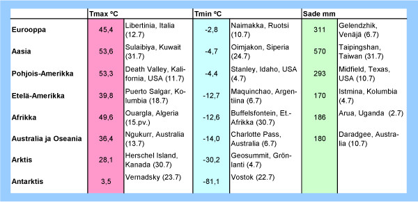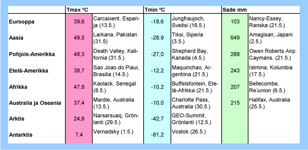 Taulukko: Kesäkuun 2012 ylimmät ja alimmat lämpötilat sekä suurimmat vuorokautiset sademäärät eri puolilla maapalloa