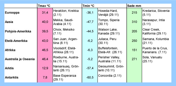 Taulukko: Marraskuun 2012 ylimmät ja alimmat lämpötilat sekä suurimmat vuorokautiset sademäärät eri puolilla maapalloa