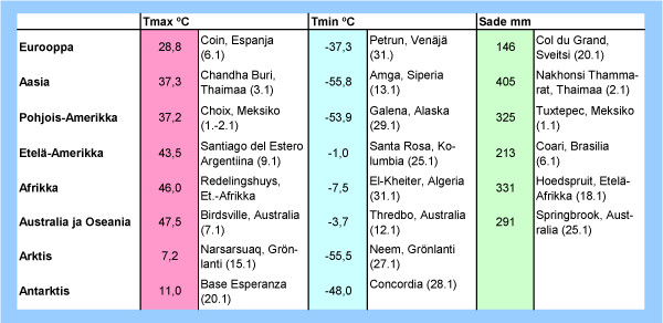Taulukko: Tammikuun 2012 ylimmät ja alimmat lämpötilat sekä suurimmat vuorokautiset sademäärät eri puolilla maapalloa