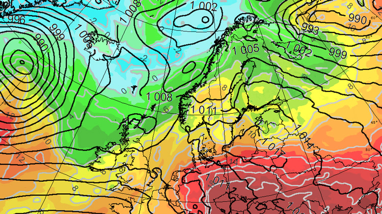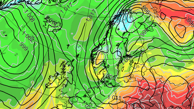 Sen sijaan GFS:n ennusteessa Kuolan niemimaan yllä oleva matalapaineen keskus sekä kylmä ilmamassa pitävät sään erityisesti Lapissa koleana ja sateisena. Toisaalta etelässä on selvästi pohjoista lämpimämpää, ja sateet saapuisivat sinne vasta juhannusyöksi.