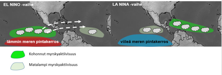 Näyttääkin siltä, että tavanomaista lämpimämpi pintavesi on tärkeämmässä roolissa myrskyaktiivisuudessa kuin vallitseva El Niño- tai La Niña -vaihe. Vuosina 2021–2022 koettu La Niña -jakso oli toistaiseksi lämpimin La Niña -jakso, kun taas viime vuosi oli El Niño -vuosista kaikkein lämpimin. Vuoden 2023 keskilämpötila ylitti 1,18 asteella viime vuosisadan globaalin keskilämpötilan (+13,9 astetta).