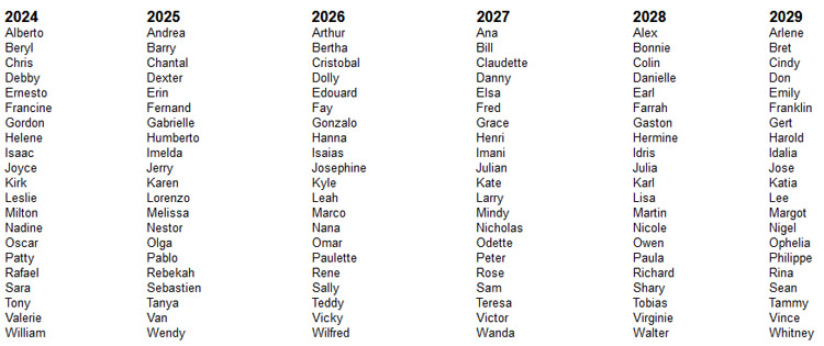 Aakkosjärjestyksessä etenevä 21 nimen lista on maailman ilmatieteen järjestön (WMO) valitsema, ja se kiertää joka seitsemäs vuosi uudelleen. Jos jokin myrsky on erityisen voimakas ja aiheuttaa laajoja vahinkoja, poistetaan nimi lopullisesti kiertävästä nimilistasta ja korvataan uudella. Kuluneen 70 vuoden aikana peräti 96 Atlantilla ja Karibianmerellä esiintynyttä tuhoisaa myrskyä on poistettu listalta (mm. Andrew, Hugo, Irma, Katrina, Mitch ja Sandy). Itäisen Tyynenmeren puolella nimiä on lakkautettu yhteensä 21 kappaletta (mm. Iniki, Patricia ja Otis).