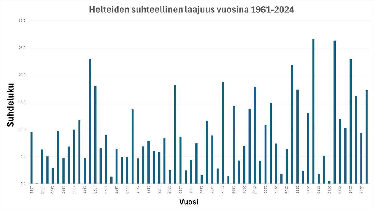 Kuvassa 2 on vertailtu vuosia helteiden alueellisen laajuuden kannalta. Hellerajan ylittäneistä hilapisteistä on laskettu päivittäinen suhteellinen osuus kaikista hilapisteistä, minkä jälkeen päivittäiset arvot on summattu yhteen koko vuoden ajalta. Mitä laajemmalla alueella hellettä on ollut päivien aikana, sitä suurempi suhdeluku on. Tämän laskutavan perusteella helteisimmät kesät olisivat olleet kesät 2014, 2018 ja 2021. Kuluva kesä olisi alustavasti sijalla 11. ja hellepäivissä laskettuna ennätysvuosi 2002 vasta sijalla 15.