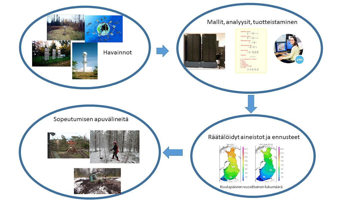 Hankkeen ensimmäisessä työpaketissa "Sopeutumisen tietoaineistot ja työkalut" tuotetaan keskeisiä sää- ja ilmastoaineistoja, jotka antavat pohjan metsäbiotalouden sopeutumistoimille: