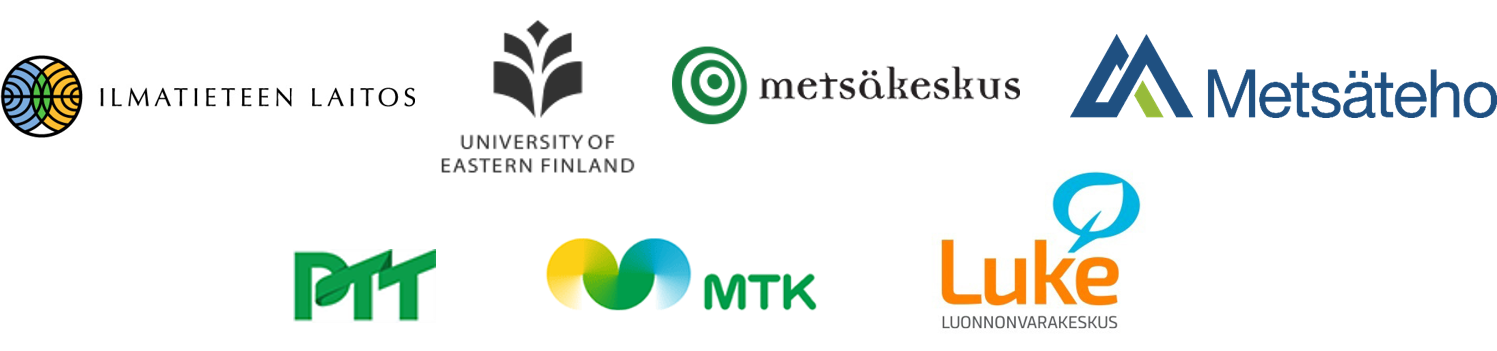 Toteuttajat: Hankkeen toteutuksesta vastaa Ilmatieteen laitoksen johtama konsortio, johon kuuluvat Itä-Suomen yliopisto, Metsäkeskus, Metsäteho, Pellervon taloustutkimus sekä Maa- ja metsätaloustuottajain Keskusliitto (MTK) sekä Luonnonvarakeskus.