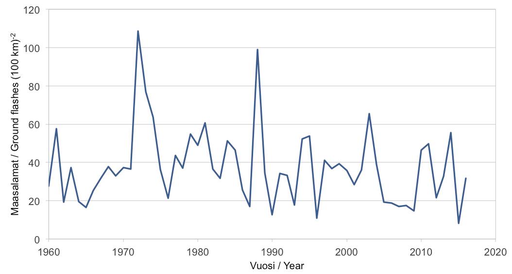 Kuten ukkospäiväluvunkin tapauksessa, salamatiheydessä on huomattavaa vuosittaista vaihtelua, niin kuin Suomen säässä yleensäkin. Joinakin vuosina ukkosia ja salamoita on esiintynyt runsaasti, toisina vähänlaisesti. Jakson 1960-2023 ennätysvuodet ovat olleet 1972 sekä 1988, jolloin Suomessa esiintyi yli 300 000 maasalamaa. Ilmastollisen jakson 1991-2020 keskimääräinen vuotuinen maasalamamäärä on reilut 113 000.