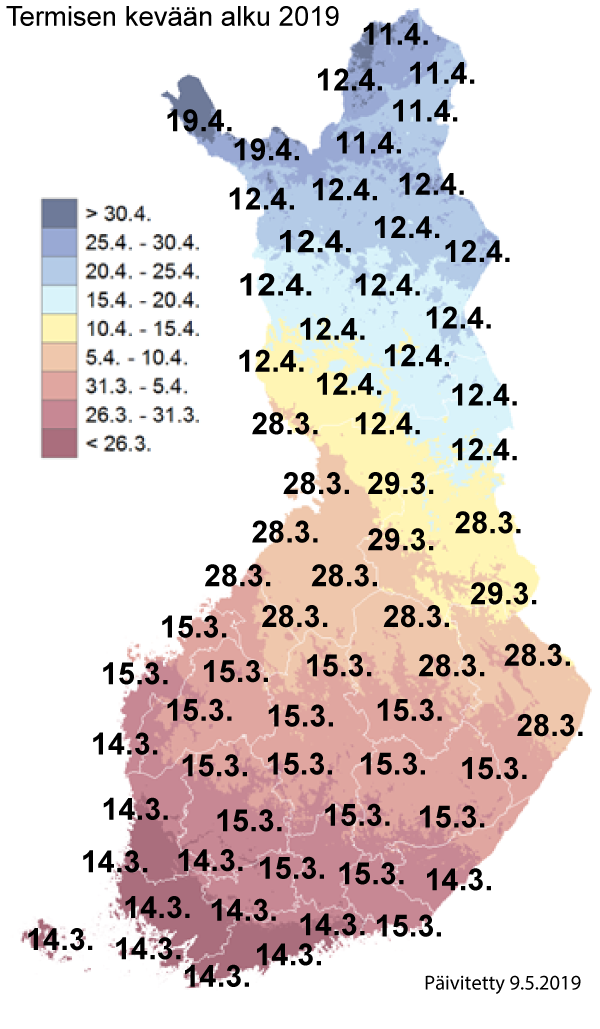 Termisen talven ja termisen kevään alkamispäivämäärät mustalla. Värilliset vyöhykkeet kuvaavat termisen vuodenajan keskimääräistä alkamisajankohtaa vertailukaudella 1981-2010.