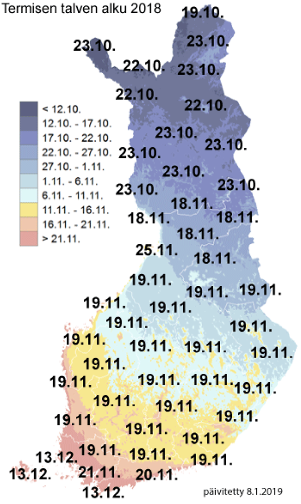 Termisen talven 2018-2019 alkamis- ja päättymispäivämäärät.