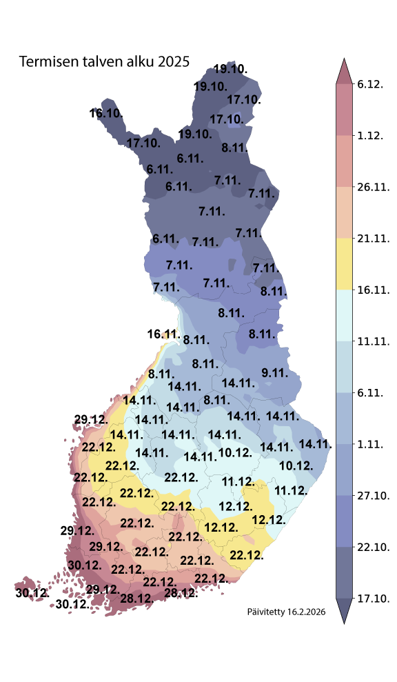 Termisen talven alkamispäivämäärät mustalla. Värilliset vyöhykkeet kuvaavat termisen vuodenajan keskimääräistä alkamisajankohtaa vertailukaudella 1991-2020.