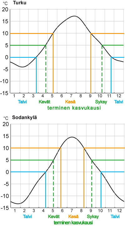 Esimerkiksi Sodankylässä kevät ja kesä saapuvat noin kuukautta myöhemmin ja vastaavasti syksy ja talvi tulevat noin kuukautta aikaisemmin kuin Turussa.