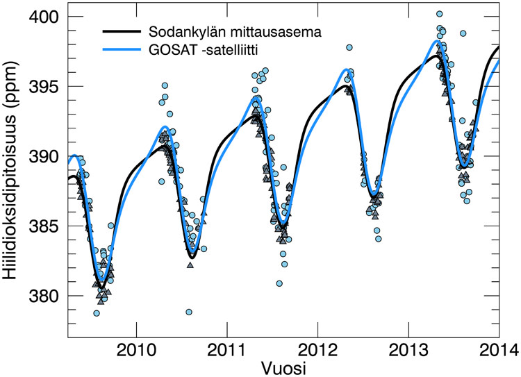 Hiilidioksidipitoisuus Sodankylän yllä satelliitilla ja mittausasemalla mitattuna. Harmaat kolmiot ovat Sodankylän mittausasemalla mitattuja hiilidioksidipitoisuuden päiväkeskiarvoja ja siniset pallot satelliitin mittaamia päiväkeskiarvoja. Näihin on tehty vuodenaikaisvaihtelun sovitus matemaattisilla menetelmillä (viivat).