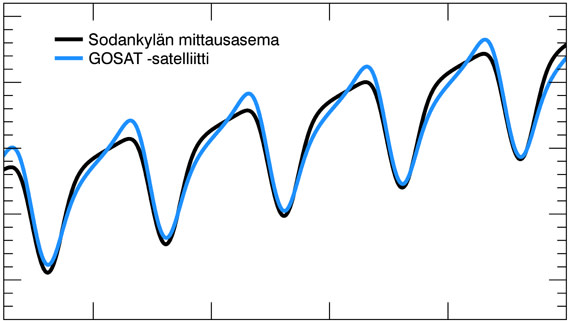 Japanilainen Greenhouse Gases Observing Satellite (GOSAT) –satelliitti on mitannut ilmakehän hiilidioksidia vuodesta 2009. Juuri julkaistussa kansainvälisessä tutkimuksessa pystyttiin osoittamaan, että mitattu vuodenaikaisvaihtelu vastaa hyvin todellisuutta. Talvella fossiilisten polttoaineiden käyttö nostaa hiilidioksidin määrää, mutta loppukeväästä pohjoisen pallonpuoliskon kasvien yhteyttäminen laskee hiilidioksidin määrää aina seuraavaan syksyyn saakka.