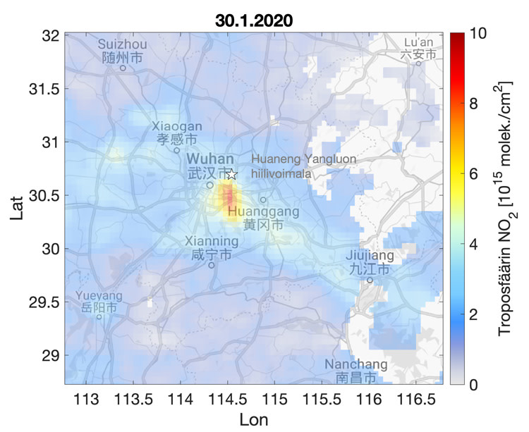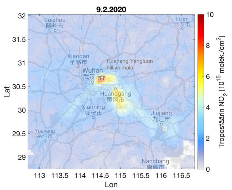 Kuvat. TROPOMI-satelliitin havaitsema alailmakehän typpidioksidipitoisuus Wuhanissa: 1) 20.1. ennen koronaviruskaranteenin alkua ja kiinalaista uuttavuotta, 2) 30.1. ja 9.2. karanteenin alkamisen ja kiinalaisen uudenvuoden jälkeen sekä 3) 17.2. uudenvuodenlomien päättymisen jälkeen. Karttaan on myös merkitty Wuhanissa oleva Huaneng Yangluon hiilivoimala, jonka päästöt näkyvät satelliittihavainnoissa.