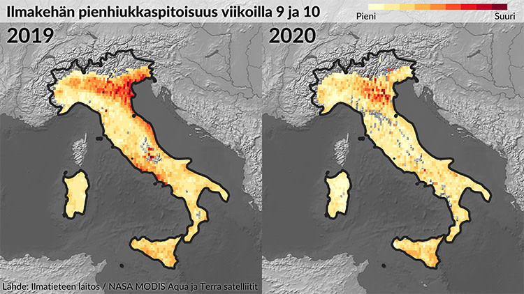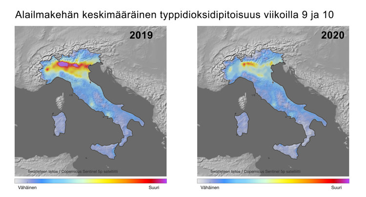 Alailmakehän keskimääräiset typpidioksidipitoisuudet ovat viikkojen 9 ja 10 aikana olleet Italian pohjoisosissa selvästi viime vuoden vastaavaa ajankohtaa pienemmät. Myös pienhiukkasten määrät ovat satelliittihavaintojen perusteella pienemmät kuin samaan aikaan viime vuonna.