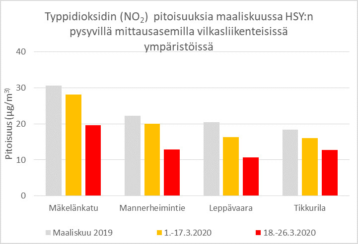 "HSY:n ilmanlaatuasemilla typpidioksidin pitoisuudet ovat laskeneet noin 30–50 prosenttia vilkasliikenteisillä kaduilla ja katukuiluissa. Päästöjen lisäksi myös sääolot vaikuttavat ilmanlaatuun, joten ilmanlaatuvaikutusten arviot tarkentuvat kun vähäpäästöinen tilanne jatkuu", kertoo ilmansuojeluasiantuntija Jarkko Niemi Helsingin seudun ympäristöpalvelut HSY:stä.
