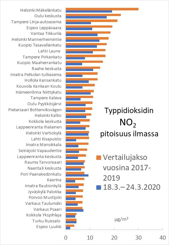 Ilmanlaadun seurantatulokset Suomen kaupungeista osoittavat, että typpidioksidipitoisuudet (NO2) ovat laskeneet noin 40 prosenttia koronaviruksen aiheuttaman poikkeustilan astuttua voimaan 18.3.2020. Typpidioksidia on runsaasti autojen pakokaasuissa, joten liikennemäärien voimakas väheneminen näkyy nopeasti kaupunkien ilmanlaadun paranemisena.