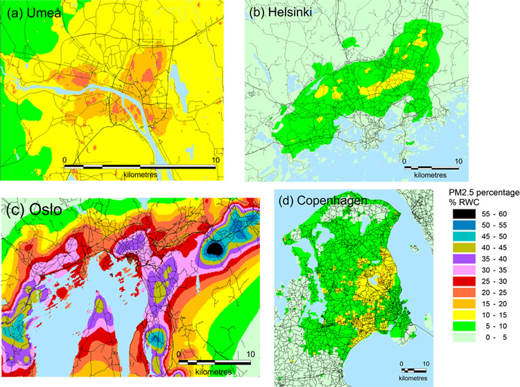 Pienhiukkasten pitoisuudet, kaikki päästöt huomioon ottaen, olivat korkeimmat Kööpenhaminassa, jossa pitoisuudet vaihtelivat alueellisesti arvosta 9 mikrogrammaa kuutiossa (µg/m3) arvoon 13 µg/m3. Pienhiukkaspitoisuudet olivat toiseksi korkeimmat Oslossa, seuraavaksi korkeimmat Helsingissä ja matalimmat Uumajassa. Helsingissä pitoisuudet vaihtelivat välillä 6–10 µg/m3.