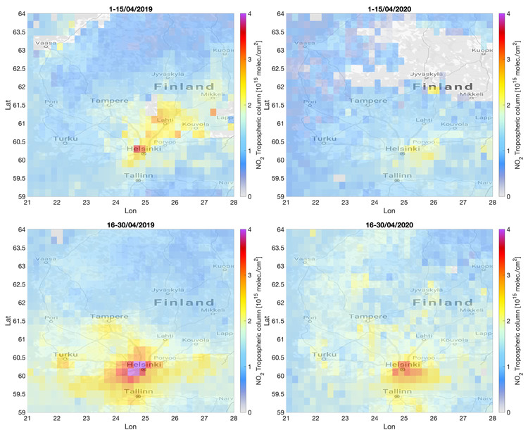 Kuva 3: TROPOMI-instrumentin tekemien alailmakehän NO2-mittausten huhtikuun keskiarvot Etelä-Suomen alueella Uudenmaan eristyksen aikana (1.–15. huhtikuuta, yläpuolella) ja eristyksen päättymisen jälkeen (16.–30. huhtikuuta, alapuolella). Vasemmalla: 2019, oikealla: 2020. Siniset alueet kertovat alhaisemmista pitoisuuksista, kelta-punaiset alueet korkeammista pitoisuuksista.