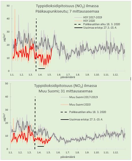 Suomalaiskaupunkien ilman typpidioksidipitoisuudet ovat olleet selvästi pitkän ajan keskiarvojen alapuolella maaliskuussa alkaneen poikkeustilan aikana. Tämän osoittavat sekä maan pinnalla tehtävä ilmanlaadun seuranta että satelliittihavainnot.