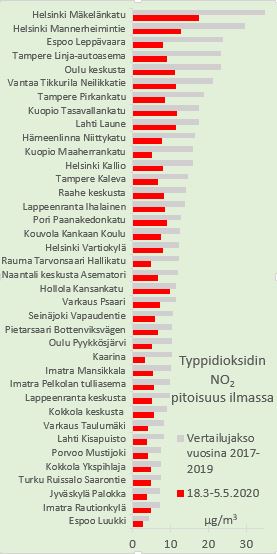 Kuva 2: Typpidioksidin pitoisuudet ilmassa asemittain 18.3.-5.5.2020. Vertailuaineistona on vastaavan ajankohdan keskiarvo vuosilta 2017-2019.